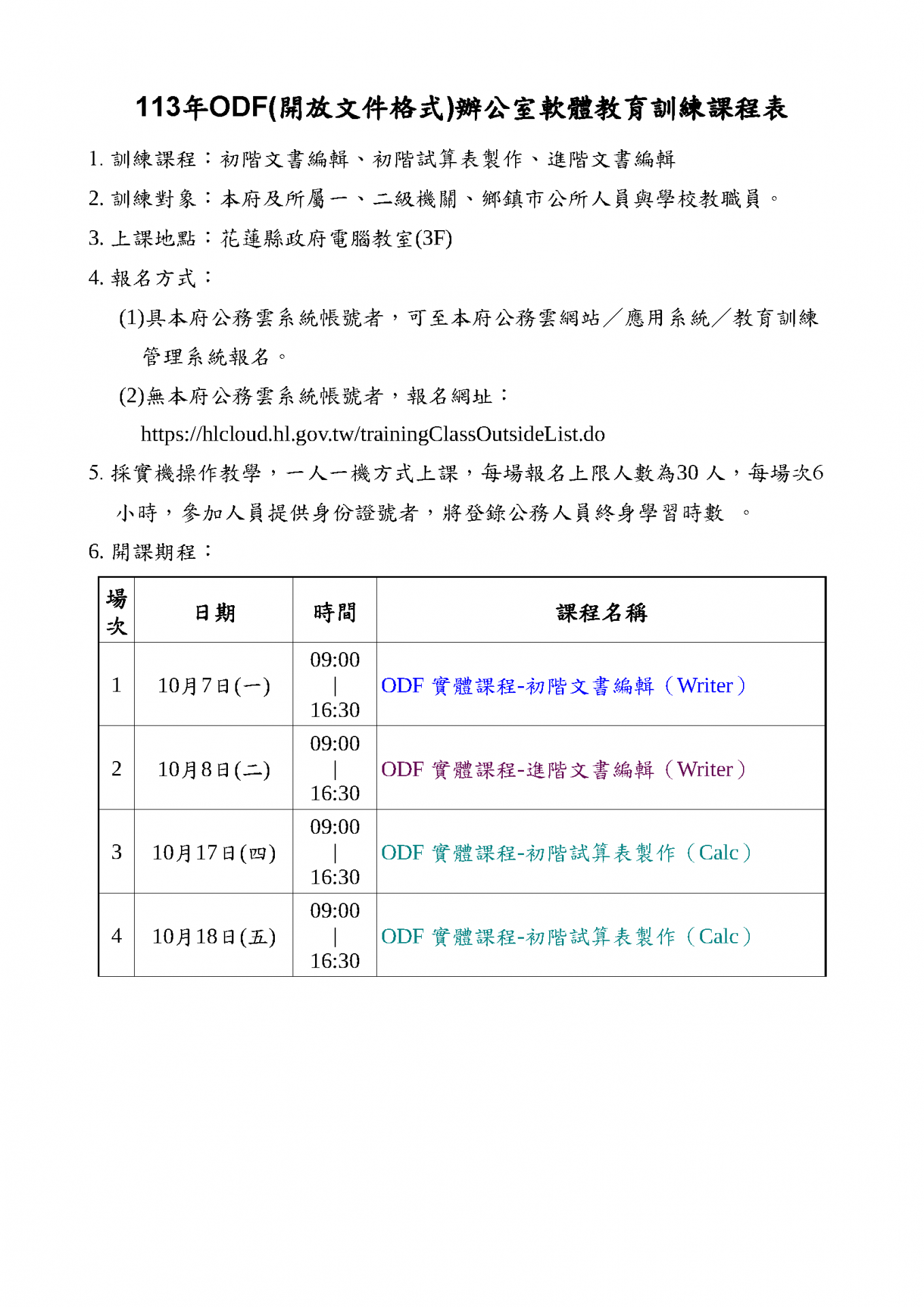 113年ODF(開放文件格式)辦公室軟體教育訓練課程表